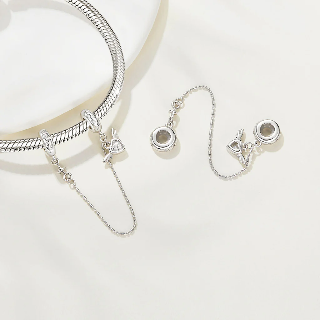 Este dije tiene alas en forma de corazón y te anima a perseguir apasionadamente tus sueños. Diseñado con una cadena de seguridad de posicionamiento de silicona, garantiza que tus preciados amuletos se mantengan seguros mientras persigues tus aspiraciones. Esta pieza es una combinación perfecta de elegancia e inspiración para tu viaje.