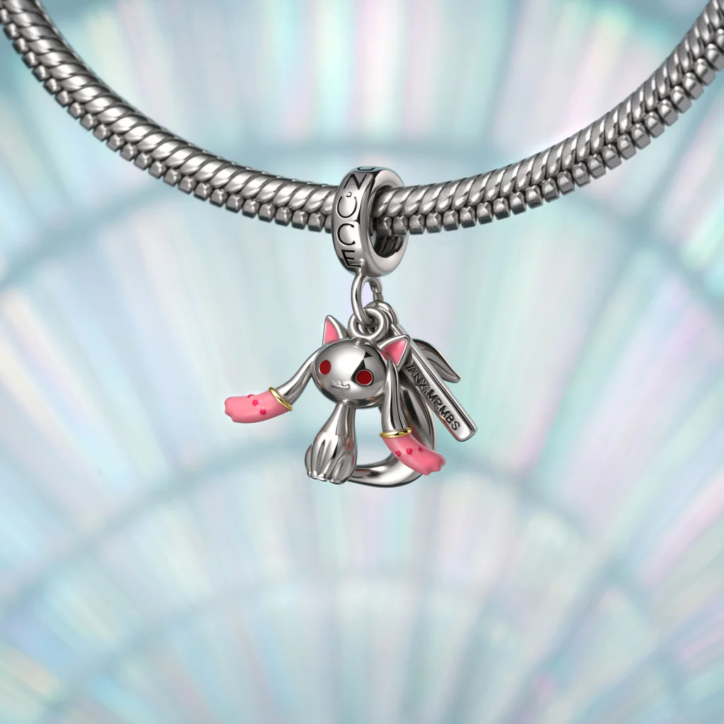 Elaborado en plata de ley 925, este colgante presenta la forma icónica de Kyubey: una criatura felina con pelaje blanco como la nieve y sus distintivas cuatro orejas. En su parte posterior hay un óvalo rosa intenso en forma de huevo que se abre para extraer fragmentos de la Semilla del Dolor.